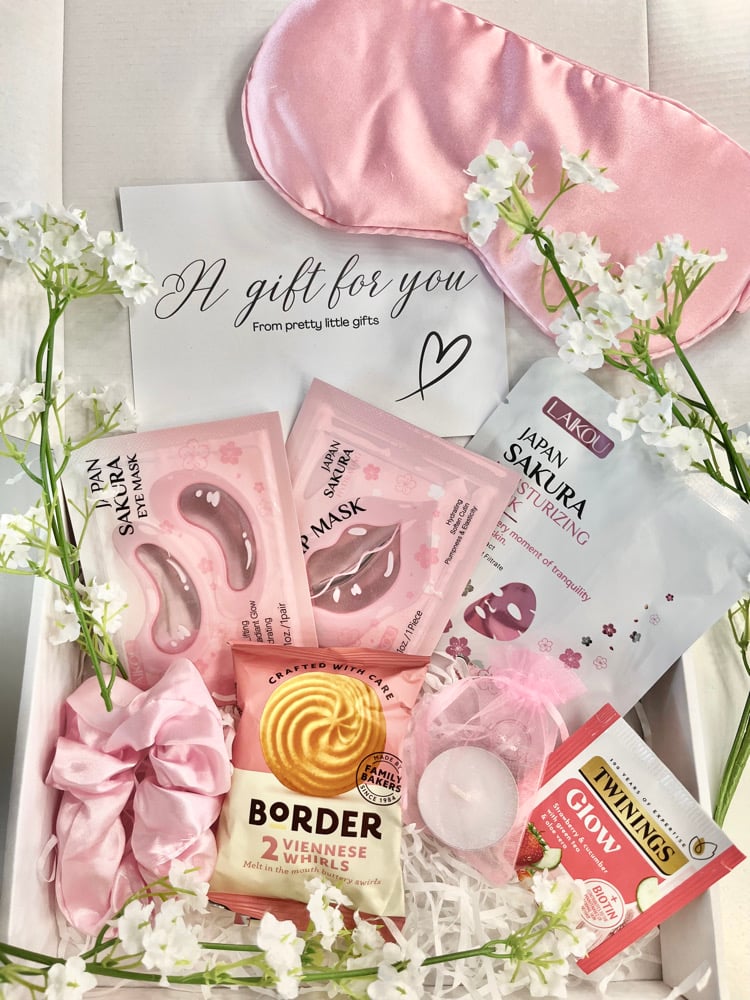 Face mask Satin eye mask Under eye patches Lip mask Border biscuits Twinings tea bag Tea light candle Scrunchie